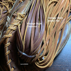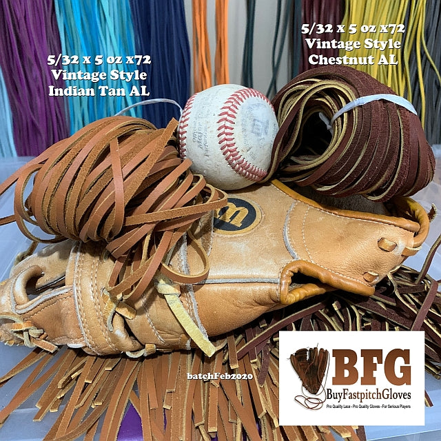 These Vintage Style laces are 5/32 inch wide and come in 72 inch lengths. Many older gloves made in the early 1970's and before used this width. The lace is even a bit thinner - it is only 5 oz leather. That just means it is thinner and will fit easier into those old style metal grommets. And the length is generally long enough to finish a whole section of your glove.